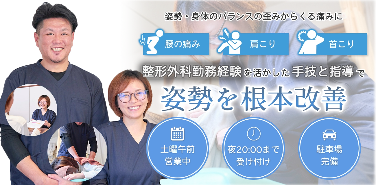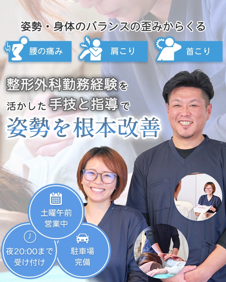 当院では、国家資格を持つ柔道整復師が施術を担当し、整形外科での勤務経験を活かした専門的な視点でお身体の状態を丁寧に確認します。痛みのある部分だけでなく、原因に着目した施術を行い、一人ひとりに合わせたオーダーメイドのケアを提供しています。